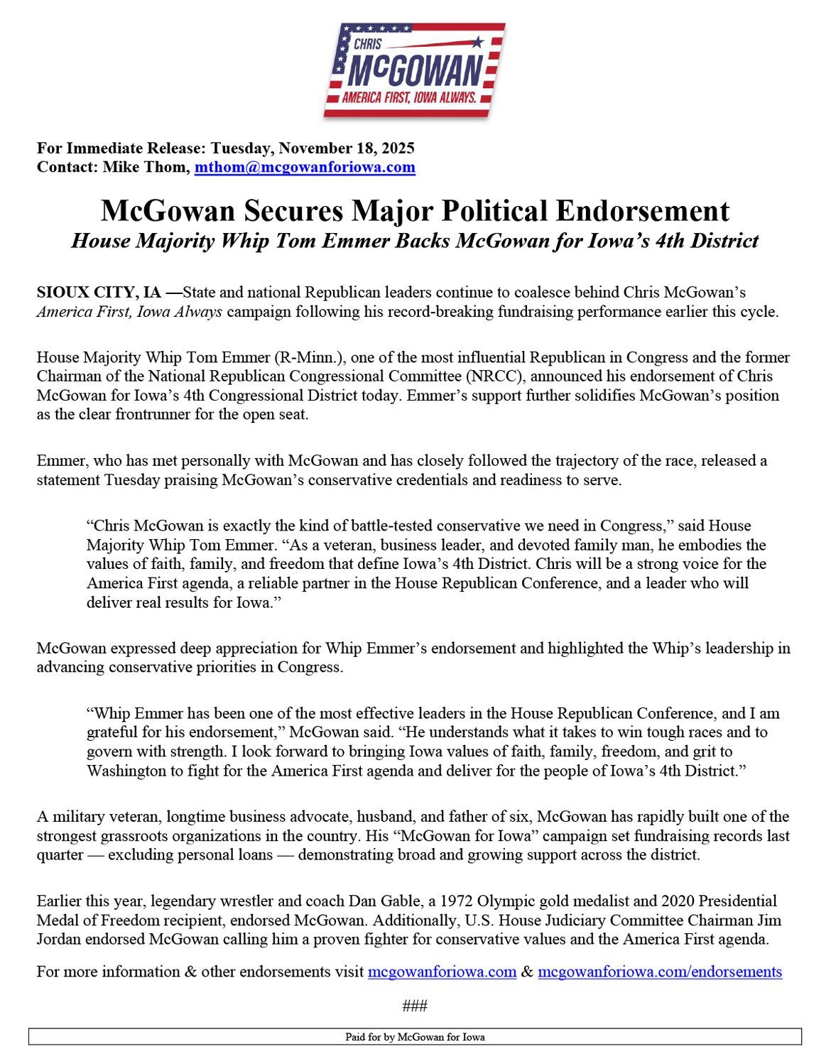 Chris McGowan was born and raised in Iowa's 4th Congressional District and his children represent the fifth generation to call northwest Iowa home.